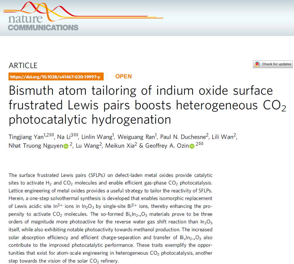 晶格工程是调控氧化物电子结构等性质的有效手段,基于前期研究积累,颜廷江教授与加拿大多伦多大学的Geoffrey Ozin教授合作,提出了一种简便的溶剂热方法,在In2O3中实现了Bi3+对In3+位点的原子级精准取代,进而实现了对路易斯酸碱性质和催化剂电子光学性质的合理调控。通过选用廉价和安全的铋替代铟,可以制备出具有广谱太阳光吸收的BixIn2-xO3。研究表明,单位点Bi3+代替In3+后,提供了性质更强的路易斯酸碱对Bi3+/O2-,可以显著增强对CO2分子的吸附和活化,同时Bi 6s2孤对电子引入了新的能级态。这种原子精准的晶格工程,实现了SFLPs位点活性和太阳能光子吸收效率的有效调控,大大增强了光催化CO2加氢性能。