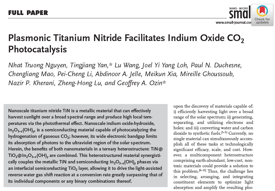 2020年11月,颜廷江教授与Ozin教授继续合作,将SFLPs型In2O3-x(OH)y与具有金属特性的TiN材料耦合,经过煅烧处理后,所得复合催化材料TiN@TiO2@In2O3−x(OH)y可以在较宽的光谱范围内收集阳光,并透过光热效应产生高的局部温度,使其能够以极大超过单个组分或任何二元组分的转化率驱动光激活水气变换反应。相关研究成果以“Plasmonic Titanium Nitride Facilitates Indium Oxide CO2 Photocatalysis”为题发表在国际著名刊物Small(影响因子11.459)。曲阜师范大学为论文的通讯署名单位。