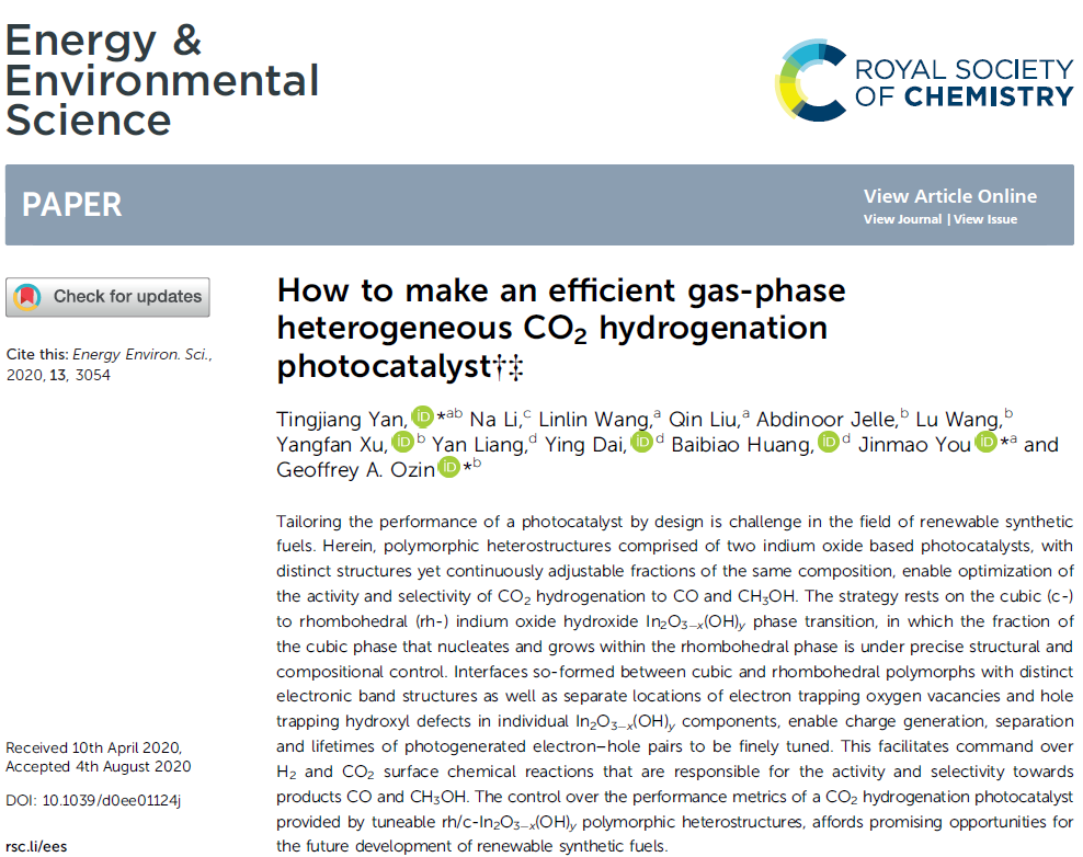 此外,2020年8月,颜廷江教授还基于立方相(cubic,c-)到菱形相(rhombohedral,rh-)氧化铟In2O3-x(OH)y的相变,通过调节rh/c-In2O3-x(OH)y多晶型异质结对CO2加氢光催化剂性能的指标,构建出了新型高效的缺陷异相结光催化剂,对未来可再生合成燃料的发展提供了良好的契机。相关工作发表以“How to Make an Efficient Gas-Phase Heterogeneous CO2 Hydrogenation Photocatalyst”为题发表在国际顶级期刊Energy & Environmental Science(影响因子30.289)。曲阜师范大学为论文的第一署名单位和第一通讯署名单位。