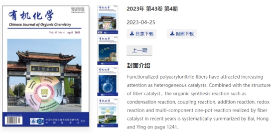 近日,应安国教授团队综述论文“功能化聚丙烯腈纤维促进有机反应的研究进展”发表在国内知名SCI收录杂志《有机化学》上,并被选为第一封面刊登。研究生白林盛为论文的第一作者,应安国教授为通讯作者,曲阜师范大学为唯一单位。聚丙烯腈纤维(PANF)具有出色的机械强度、耐化学性和良好的热稳定性, 而且易于进行改性。近些年功能化 PANF 作为非均相催化剂被广泛应用于有机合成领域, 文章综述了功能化 PANF 催化剂在有机反应中的研究成果与进展, 包括缩合反应、偶联反应、加成反应、氧化还原反应及多组分一锅法反应等。介绍了纤维催化剂的合成及 结构, 讨论了催化性能, 分析了可能的催化机理, 为开发更优的功能化 PANF 做铺垫。