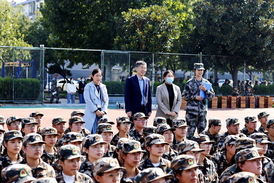 党委书记赵琪、党委副书记孙金玲、团委书记王亚平亲临现场视察指导2022级新生军训工作,慰问承训教官和参训新生。