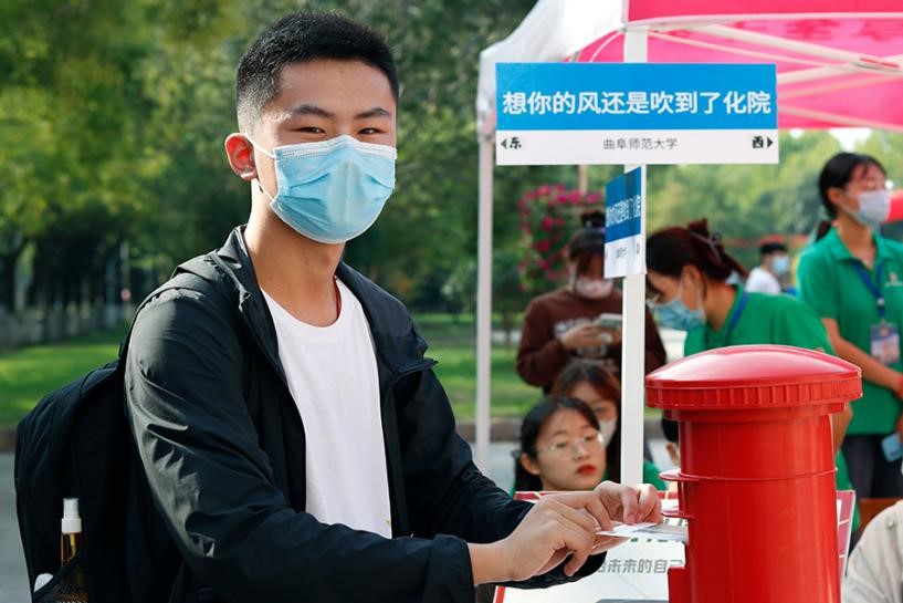在今天的迎新过程中,“青涩剪影——记录初来曲园的你”和“曲园•启航•化语——给未来的自己写一封信”活动广受好评。新生用拍立得和明信片记录自己初入校园的感受和对未来的展望。篮球比赛直播