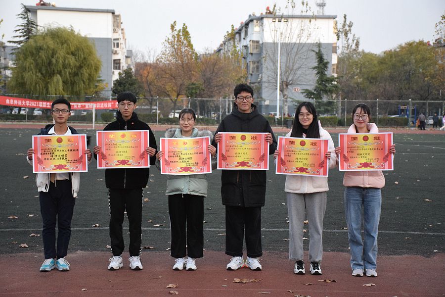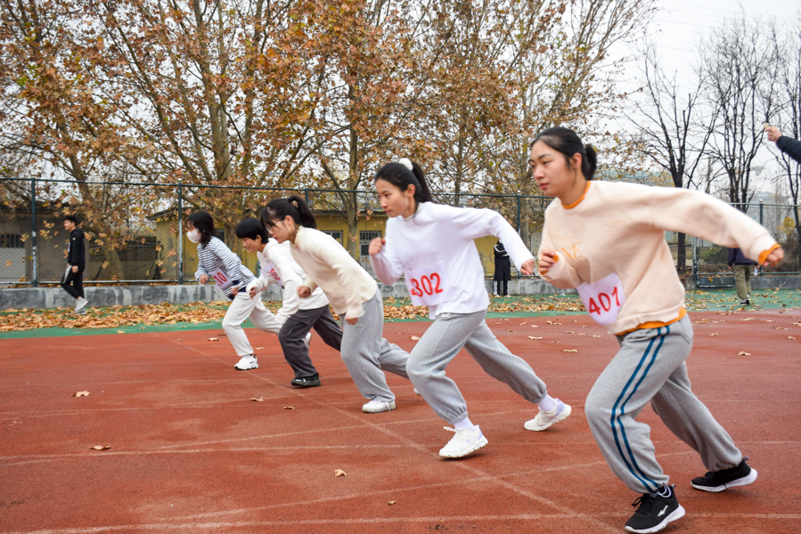 于校西田径场举办2021年冬季田径运动会。党委书记赵琪、党委副书记孙金玲、辅导员王亚平、毛艺霏、蒋君莅临现场。2020级、2021级全体同学参加本次运动会。