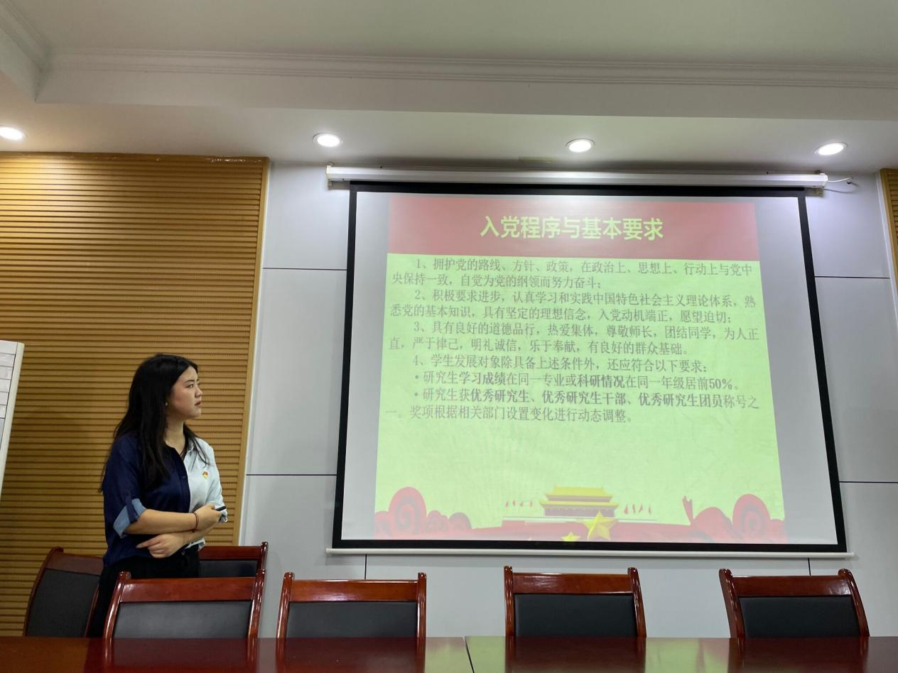会议上,朱萌同志首先讲解了中国共产党的发展历史与性质,强调中国共产党的领导是中国特色社会主义最本质的特征。其次对本院研究生党支部的基本情况、入党程序与基本要求、如何撰写入党申请书及思想汇报等方面进行了详细介绍。最后鼓励大家只有端正入党动机,坚持严以律己,才能经受住党组织的考验。会议结束之际,朱萌同志希望同学们把加入中国共产党作为砥砺前行的动力源泉,争取早日加入到党组织中来。