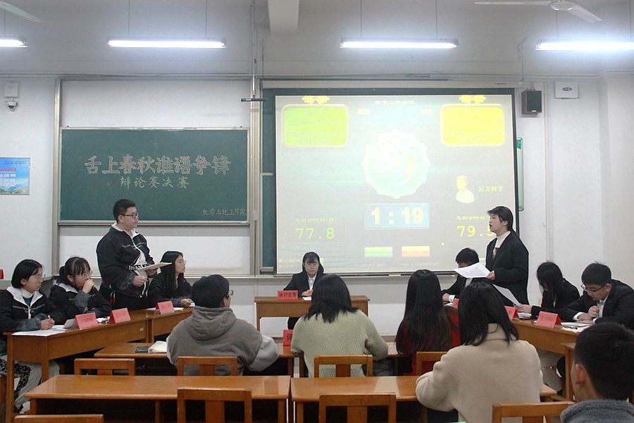团委主办,学生会学习部承办的“舌上春秋,谁‘语’争锋”辩论赛决赛在综合楼305成功举办。校辩论队队长李艾嘉,校辩论队成员、化院辩论队队长王昊担任本次大赛评委。