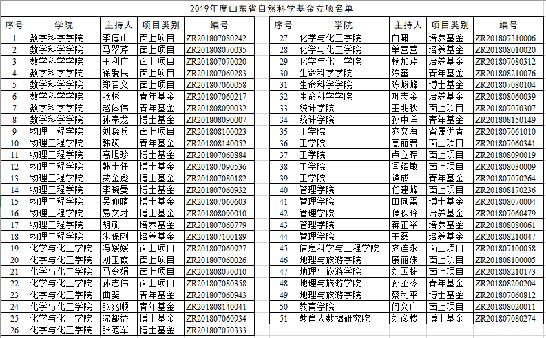 近日,山东省自然科学基金委员会公布了2019年度山东省自然科学基金项目,我校共获批51项,资助总额645万元。其中省属优青项目1项,面上项目19项,青年基金项目9项,博士基金项目13项,培养基金项目9项,立项数量比上一年度增长21项,获资助经费增加267万,立项数和经费数都有大幅提高。