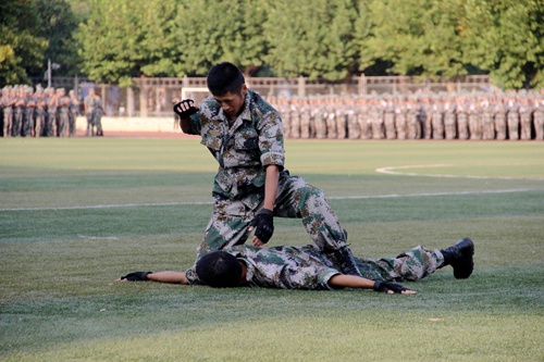大会伊始,跑步连、擒敌拳方队、应急棍术方队等七个方队依次进行成果展示。齐步跑步连的英姿飒爽,擒敌拳、应急棍术连的干脆利落,定向越野连的健步如飞,引发了全体观众的热情。紧接着,军训教官带来的表演更是将全场气氛推向高潮,教官们飒爽的英姿、出色的表演、有力的口号不断赢得全场的掌声和欢呼声。军训期间,篮球比赛直播