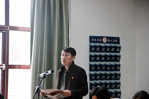 仪式在雄壮的国歌声中揭开了序幕。校团委书记宋国栋发言致辞,他首先对化学院“青马工程”培训班开班表示祝贺,对近年来学校"青马工程"开展的系列活动和取得的成绩给予肯定。他希望新时代的曲园青马人要有强烈的责任担当,要有脚踏实地的知行品质。随后,学院党委副书记毛永正宣读篮球比赛直播