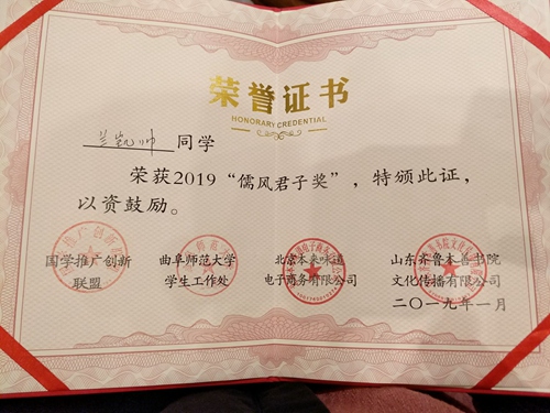 据悉,儒风君子奖学金于2018年12月由曲阜师范大学学生工作处和国学推广创新联盟发起,北京本来味道电子商务有限公司和山东齐鲁本善书院文化传播有限公司出资设立,合作期五年。2019年奖励30名优秀学生,每人2000元,授予儒风君子奖证书。此项活动旨在落实中共中央办公厅、国务院办公厅印发的《关于实施中华优秀传统文化传承发展工程的意见》和教育部传统文化进校园有关文件精神,着力打造一个权威性、标志性、公益性、群众性、时代性的国学教育及人才培养品牌项目,引领全国国学教育新时代。通过表彰奖励品德端正、尊师乐群、积极弘扬中华传统文化的优秀人才,涵育夫子基因,培养君子风范,积极推动优秀传统文化创造性转化、创新性发展,鼓励当代青年学生成长为具有社会责任感和符合时代要求的高素质拔尖创新人才,为国家未来发展增强后劲,提供一流人才支撑,为中华民族的文化复兴做出应有的贡献。