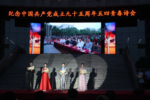 薪火承继担重任,青春激昂建新功。为庆祝中国共产党成立九十五周年,表彰先进,激励全校广大团员青年和团干部团结奋进。在纪念“五四运动”九十七周年之际,曲阜师范大学五四青年诗会于5月6日晚在孔子文化广场隆重举行。