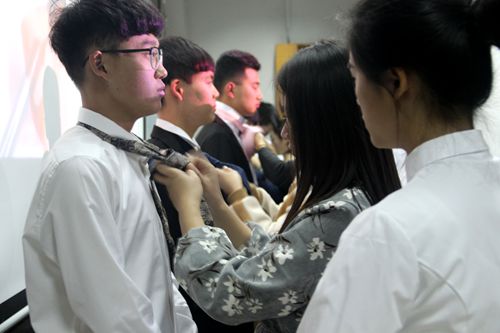 首先,每班代表在台上以新颖的方式进行自我展示,展现了独特的团队风格和积极向上的参赛精神。接下来,竞赛进入高潮—问答环节,同学们踊跃回答问题,都在为最后的胜利而奋斗。在化妆和打领带环节中,帅气的模特因美丽的领带花样而更加耀眼,美丽的小仙女在化妆完毕后更是让人眼前一亮。最后为情景展示环节,在此环节中,每个班的幽默展示形象地展示了在现实生活中我们所遇到的文明礼仪问题。