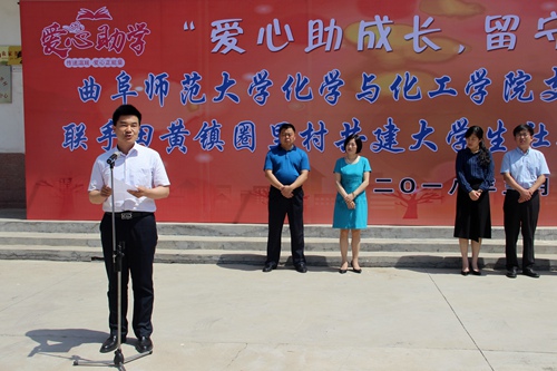 的师生的到来表示热烈欢迎,并介绍了田黄镇这一革命老区的基本情况,并指出该社会实践基地的落成对双方均有极大的好处。接着,曲阜师范大学党委副书记孙俊华以“服务社会,奉献青春”为核心宗旨指出,支教大学生应作为留守儿童的真诚伙伴,为留守儿童提供来自社会的温暖与关怀。曲阜师范大学团委副书记张明洁与邹城团市委领导为大学生社会实践基地揭牌。最后,篮球比赛直播