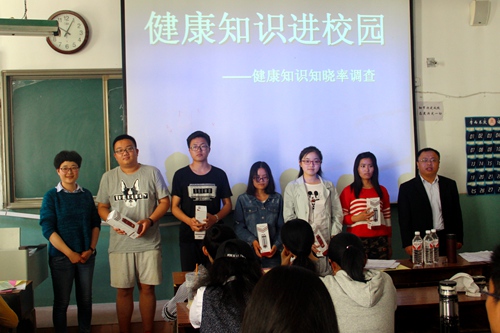 讲课之前,活动负责人先向同学们发放了有关肺结核及艾滋病的资料。颜丙光主任首先开讲。他以口头讲解为主,以PPT 为辅,具体详细地向同学们介绍肺结核的危害以及症状等。同学们仔细聆听,时时记录。而后,颜主任走下讲台,与同学亲切互动,认真耐心地为同学答疑解惑。颜主任与葛主任发放健康知晓率调查表,同学们认真作答了健康知晓率调查表并观看了有关防治肺结核以及艾滋病的视频。 视频播放完毕,同学们纷纷提出自己的疑惑,两位主任耐心解答。葛主任针对同学们填写的问卷结果,对个别问题进行了详细讲解。同时,通过调查问卷进行了现场抽奖,现场气氛活跃,两位主任与幸运同学拍照留念,活动圆满结束。