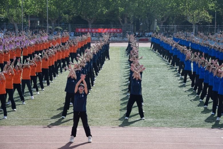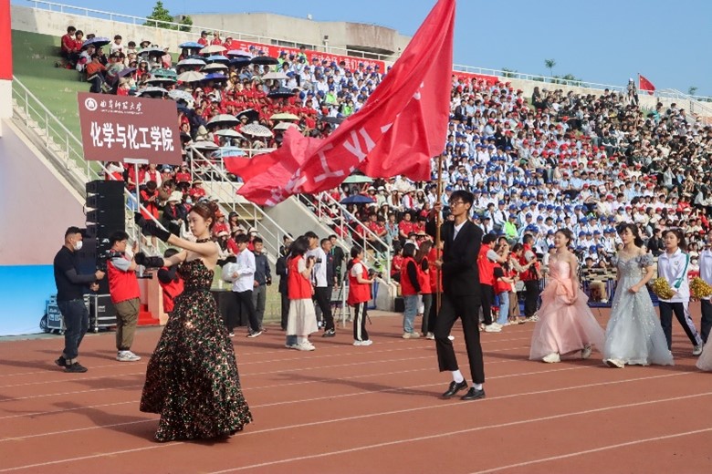 方阵代表团成员精神饱满、斗志昂扬,正步迈入场地,他们身着整齐统一的白色服装,步伐动作矫健有力。”化院齐心,奋勇争金;硫光闪烁,激情四射!”的学院口号震天响起,化院学子昂扬向上、激情四射的青春风采一览无余。广播操队在跑道上进行舞蹈演出,以舞传情,为运动健儿们振奋精神、加油鼓劲。