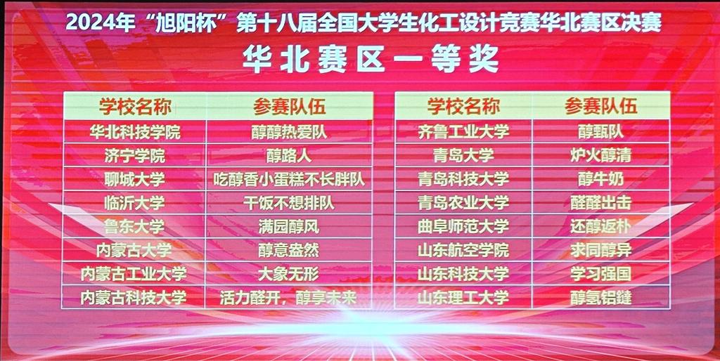 2021级化工专业学生黄嘉欣、张小婷、谢妍、马月玉、朱一坤组成的“还醇返朴”代表队获国家二等奖(华北赛区一等奖)。竞赛由中国化工学会、中国化工教育协会联合主办,是国内化工类级别最高、参赛队伍最多、影响最大的比赛,是教育部认可的全国大学生学科竞赛A类赛事之一。