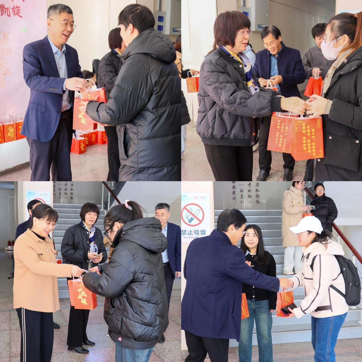 活动以““化”笔为剑,“研”途凯旋”为主题,鼓舞考研士气,缓解备考压力,为考研学子送去温暖与祝福。学院为考研学子送上暖心的考研大礼包,大礼包中包含象征“纸”定上岸的口袋纸巾、活力满满的咖啡、“士”在必得的士力架、“包”你成功的暖宝宝、好运旺旺的旺旺雪饼。老师来到学院大厅与学生们亲切交流,送上温暖的祝福和嘱咐,给予他们自信和力量,为考研学子加油助威。考研学子们接过“大礼包”,脸上洋溢着自信的笑容,坚定了考研必胜,一定上岸的决心。