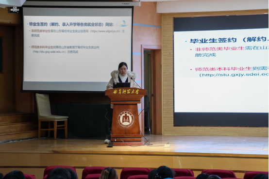 在孔子会堂召开2025届毕业生就业动员大会。学院副院长刘鹏、毕业班辅导员王亚平、2025届全体毕业生参会,会议由王亚平主持。