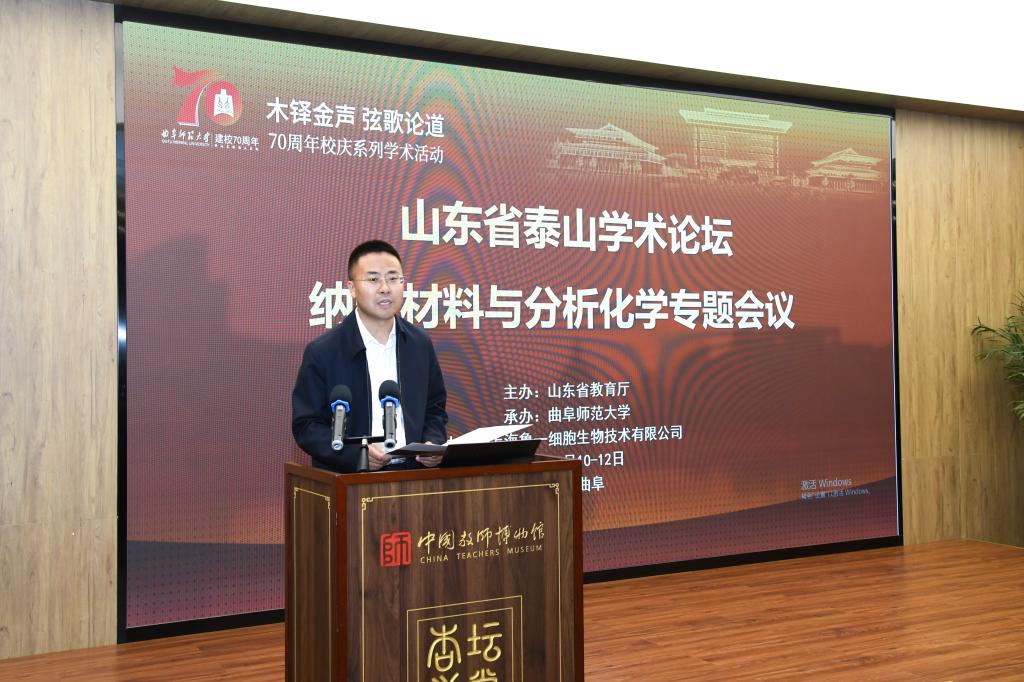 (通讯员:夏莲 摄影:董少伟)5月10日至12日,由山东省教育厅主办、曲阜师范大学承办、上海鲁一细胞生物技术有限公司协办的“山东省泰山学术论坛—纳米材料与分析化学”专题会议暨化学学科发展研讨会在曲阜师范大学召开。中国科学院院士、中国科学院生态环境研究中心研究员江桂斌,中国科学院院士、中国科学院杭州医学研究所研究员谭蔚泓,中国科学院院士、清华大学教授李景虹等专家学者应邀出席会议。