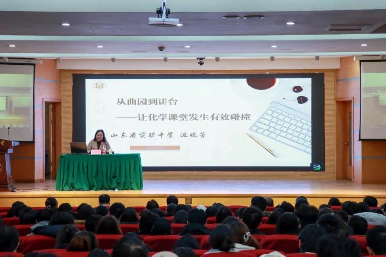 在孔子会堂举办第四届“化育新人”——未来教师创新培养论坛暨卓越校友报告会,即将奔赴实习岗位的310名2023级化学专业师范生参加论坛。山东省实验中学化学学科组主任、学院1996届优秀校友汲晓芳应邀出席论坛并作专题报告,论坛由篮球比赛直播