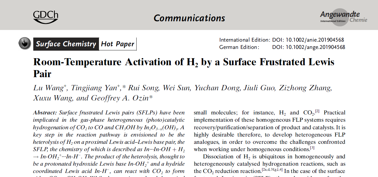 第一篇论文为“Polymorph selection towards photocatalytic gaseous CO2 hydrogenation”(DOI:10.1038/s41467-019-10524-2)发表在《自然》子刊《Nature Communications》上,颜廷江教授为该论文的第一作者与通讯作者,曲阜师范大学为第一署名单位;第二篇论文为“Room-Temperature Activation of H2by a Surface Frustrated Lewis Pair”(DOI:10.1002/anie.201904568)发表在化学领域顶级期刊《Angewandte Chemie International Edition》,并被编辑选为“Hot Paper”,颜廷江教授为共同第一作者与通讯作者,曲阜师范大学为共同署名单位。
