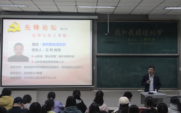 10月28日下午,“先锋论坛”第三讲在综合楼101教室举行,“泰山学者”海外特聘专家王桦教授作了题为“我和我追逐的梦---国内外创新创业之旅”的精彩报告;学院党委书记赵琪主持了本次论坛。赵书记首先向大家介绍了王桦教授及其取得的一系列科研成果。王桦教授是我校第一位从海外引进的山东省“泰山学者“海外特聘专家,也是本省第一位“泰山学者”科研团队党支部书记,先后在湖南大学、美国博伊西州立大学、美国太平洋西北国家实验室、新加坡生物工程与纳米研究院等地学习和工作,是医学与环境检测器件、纳米功能材料、药物绿色合成等领域国内外知名学者。