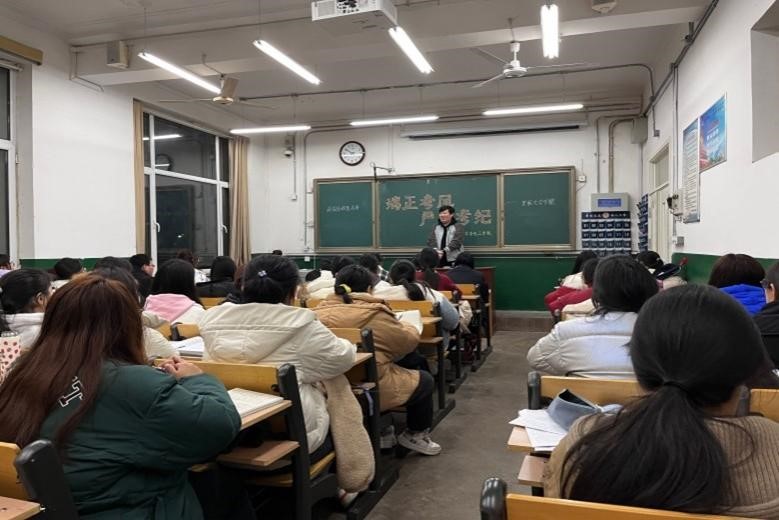 班会伊始,各年级辅导员向大家强调了本次考试的重要性,借助真实的案例警示同学们不要存在侥幸心理,坚持诚信应考。随后,辅导员们建议同学们合理规划复习时间,保持高效的学校效率与良好的心态。最后,各年级辅导员向学生提出祝愿,希望每一位同学都能够取得自己满意的成绩。
