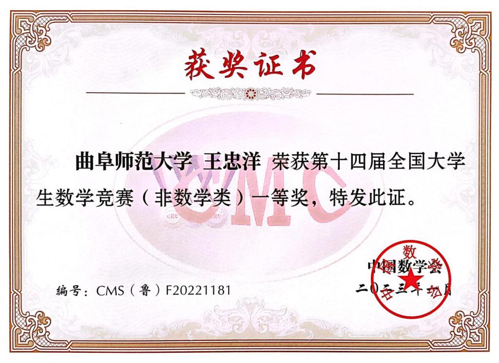 大赛准备阶段,参赛同学充分利用课余时间认真学习,积极备考;大赛进行阶段,参赛同学展示出了厚实的数学功底与沉着冷静的心态,认真思考,规范作答。最终,化院学子们不负众望,取得了优异的成绩。其中,王忠洋同学荣获国家级一等奖与省级一等奖;张琼、任雪艳、李想、马月玉、王燕语、赵欣茹、孙成杰共七名同学获得国家级三等奖和省级三等奖。