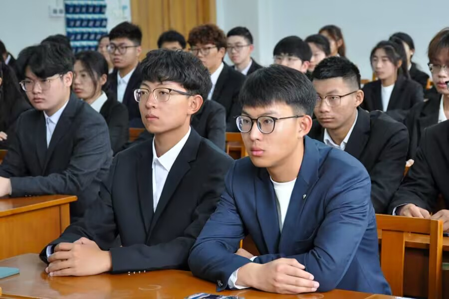 图为学院学生代表听取会议内容