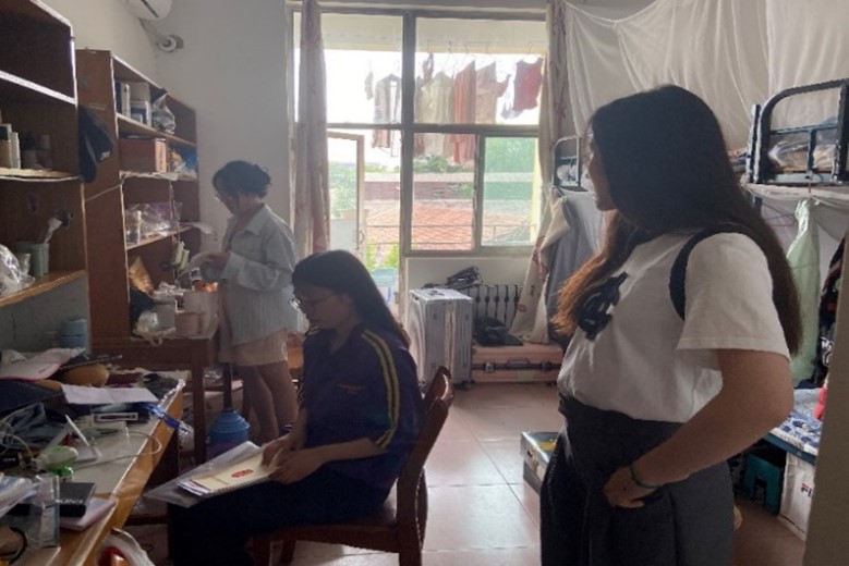 走访过程中,黄秉帅老师和孙兰馨老师询问了毕业生的毕业去向和未来规划,一字一句中都饱含着两位老师对学生们的殷切关怀。老师们对考研成功的同学表示祝贺,同时也不忘对即将踏上工作岗位的学子给予祝福。最后,老师叮嘱毕业生在离校期间注意个人安全和宿舍卫生,文明离校,展现曲园学子风采。