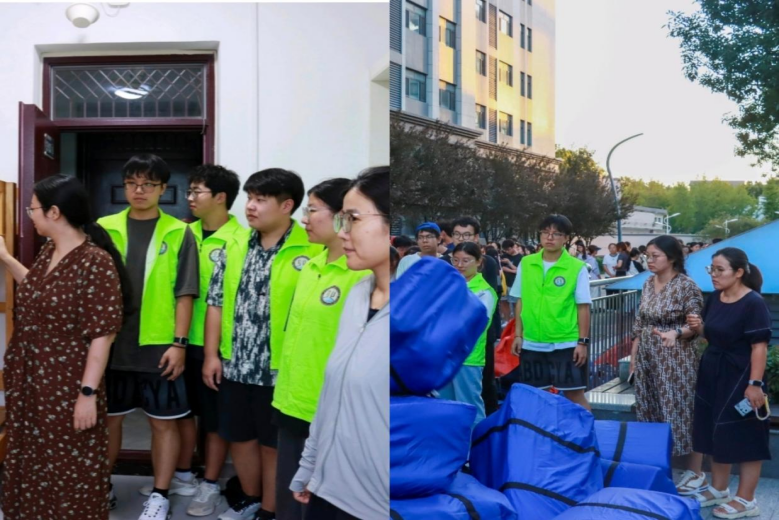 宿舍管理部在校内公寓一号楼和西公寓一号楼组织志愿者搬运新生被褥、盆子和暖壶,2025级新生辅导员王亚平、曾川亲临现场指导工作。