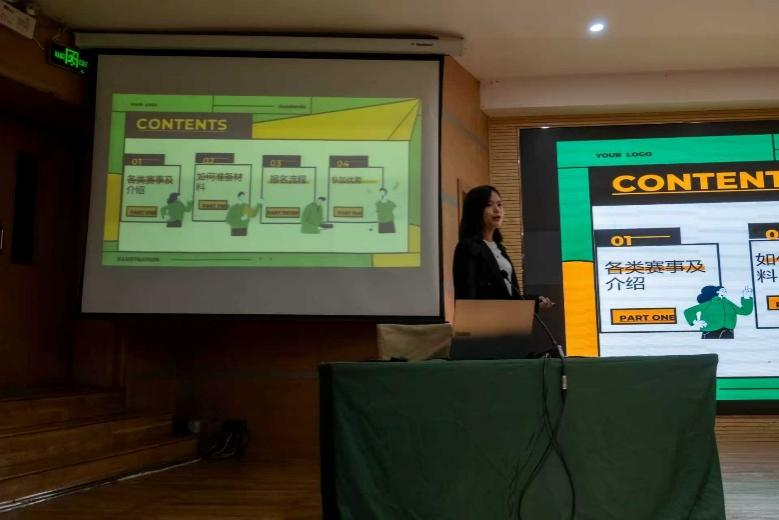 本次大会从各类赛事介绍、如何准备材料、报名流程以及参赛优势四个方面展开。会议首先明确了竞赛分类标准,将赛事分为A、B、C三类,让同学们简单了解各类赛事及其对应的等级。接着,科技部成员指导同学们如何准备参赛,包括如何从实验室项目、专业课程等挖掘选题,如何样制作计划书、PPT、视频等材料及其讲解要点等,同时明确报名全流程及材料提交要求。最后,科技部成员向同学们介绍了参赛优势,如综合测评加分、助力考研就业、提升能力与视野等,以此激励学生积极参与竞赛。