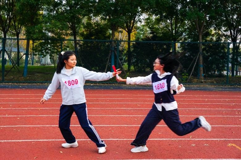 图为运动员完成接力棒交接