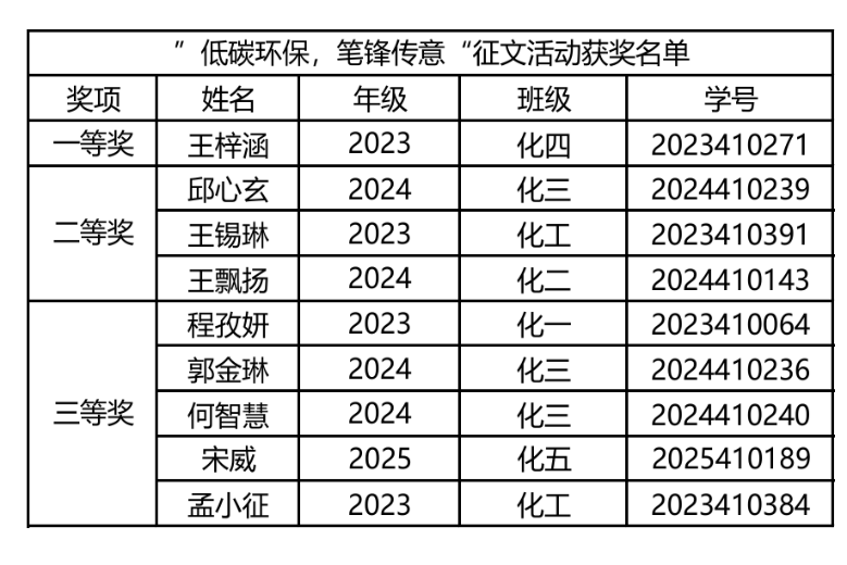 活动启动至今,同学们积极响应、热情参与,累计征集到60篇优质投稿,充分彰显了青年学子对环保事业的真挚热爱与深度思考。大家以文字为载体,聚焦“绿色低碳”“环境保护”等核心主题进行创作。本次活动一等奖获得者为王梓涵,二等奖获得者为邱心玄、王锡琳、王飘扬,三等奖获得者为程孜妍、郭金琳、何智慧、宋威、孟小征。