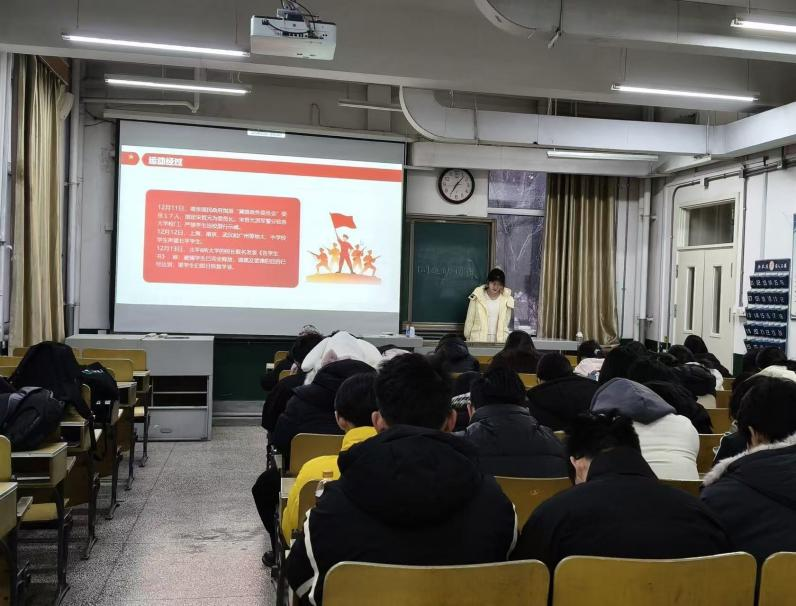 各班团支书首先围绕“一二・九”运动的时代背景、关键事件与历史意义展开讲解。随后,深入剖析了以爱国、进步、民主、科学为核心的“一二·九”精神,并结合新时代青年使命,激励青年团员将崇高的爱国情怀转化为脚踏实地、锐意进取的实际行动。同学们认真聆听,全神贯注,进一步坚定了将个人理想融入国家发展的信念。