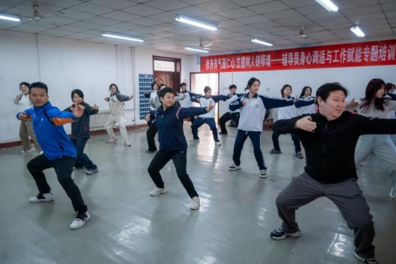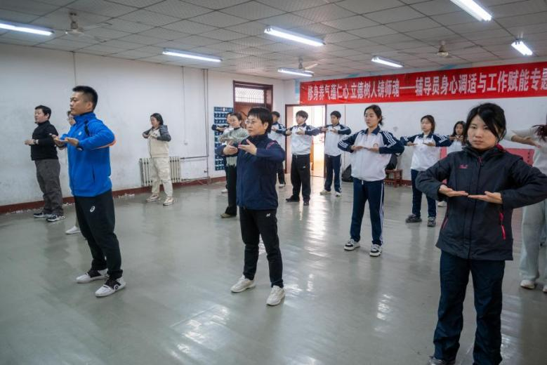 研究生辅导员李坤现场带领大家学习了传统健身功法“八段锦”。他从“两手托天理三焦”“左右开弓似射雕”等基础动作入手,细致讲解要领,指导大家通过呼吸与动作的协调,实现身心平衡。党委副书记孙金玲在参与后表示:“八段锦动作看似舒缓,实则能有效激活身体机能,帮助人迅速静心凝神。”她指出,此类活动不仅让大家体验到中华传统文化的深厚底蕴,更在动静结合中提升了情绪调节能力与工作专注度。培训在轻松积极的氛围中进行,大家表示,将以更平稳的心态、更饱满的状态投入育人工作,用“心”能量护航学生成长。