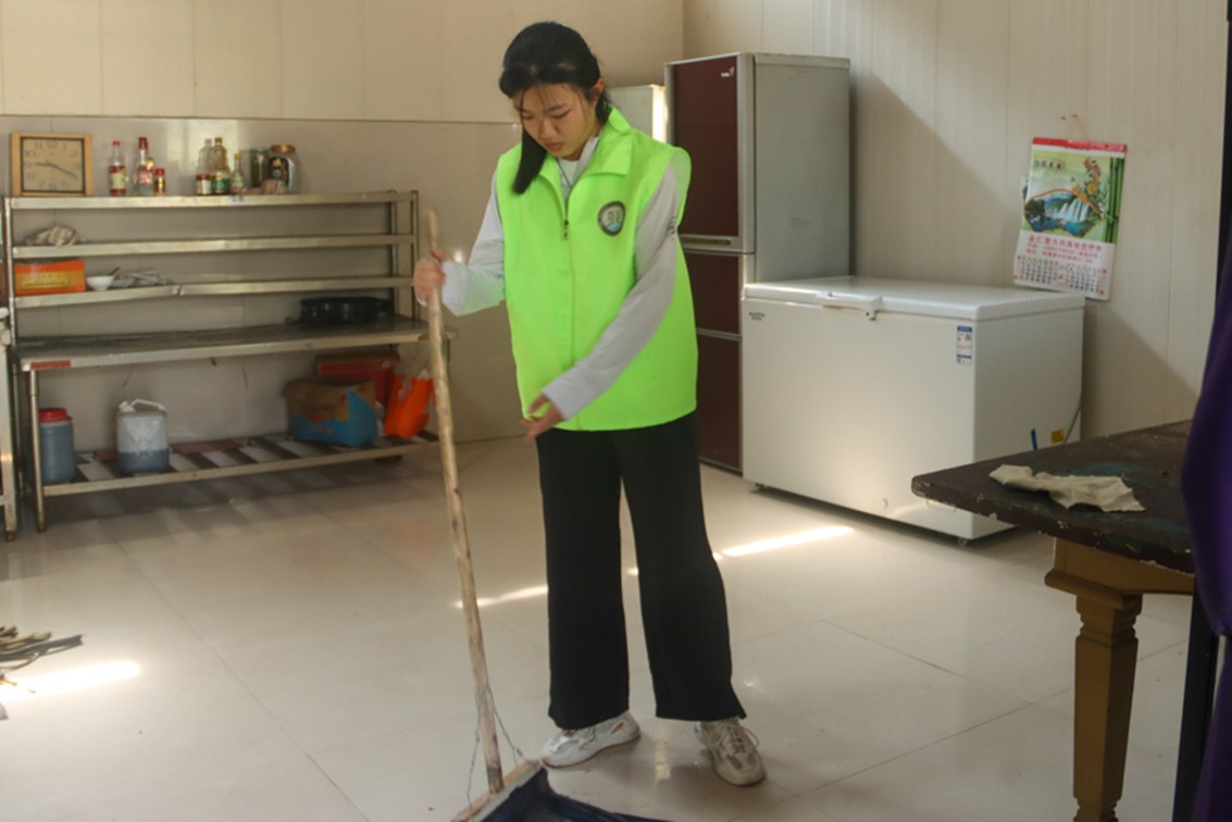 图为志愿者在打扫老人房间