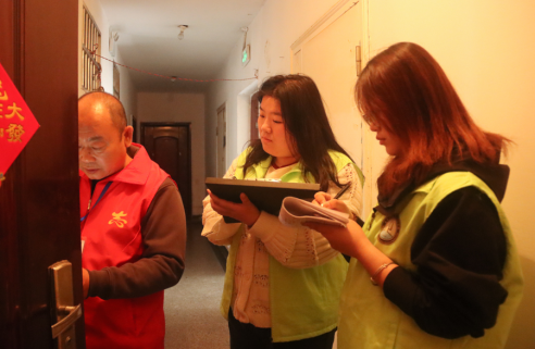 图为学院学生配合新苑社区开展住户信息调查活动
