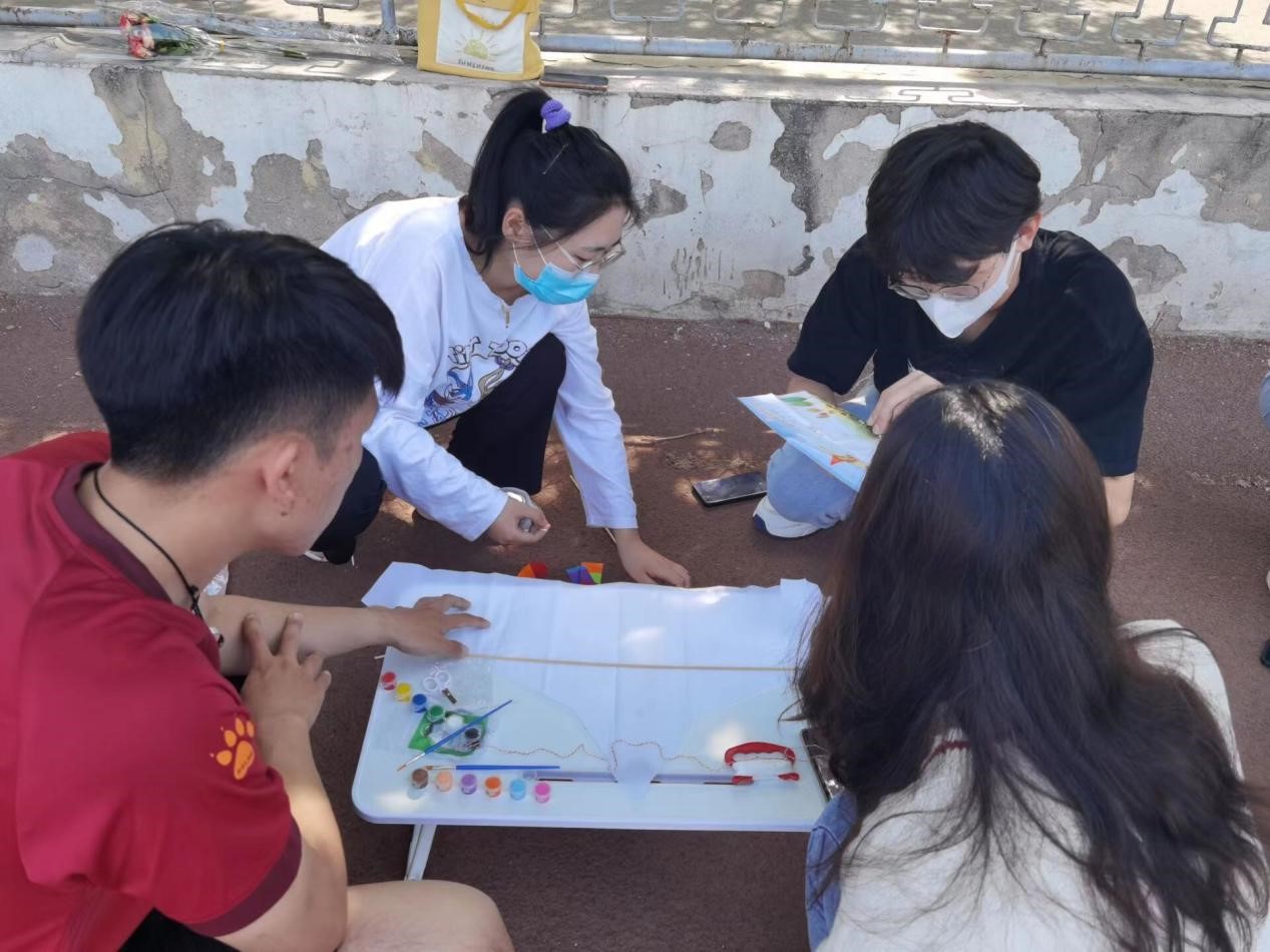 活动伊始,心理健康服务部干事向本次参赛选手介绍活动流程,并事先为选手准备好材料包、颜料等工具。参赛选手四人一组,选手们充分发挥自己的想象力,用双手和智慧为自己的风筝增添色彩。小组成员分工明确,各司其职,有条不紊。制作完成后,参赛选手们在风筝上写下自己的烦恼和愿望。最后,承载着他们心声的风筝,慢慢飞向了天空。